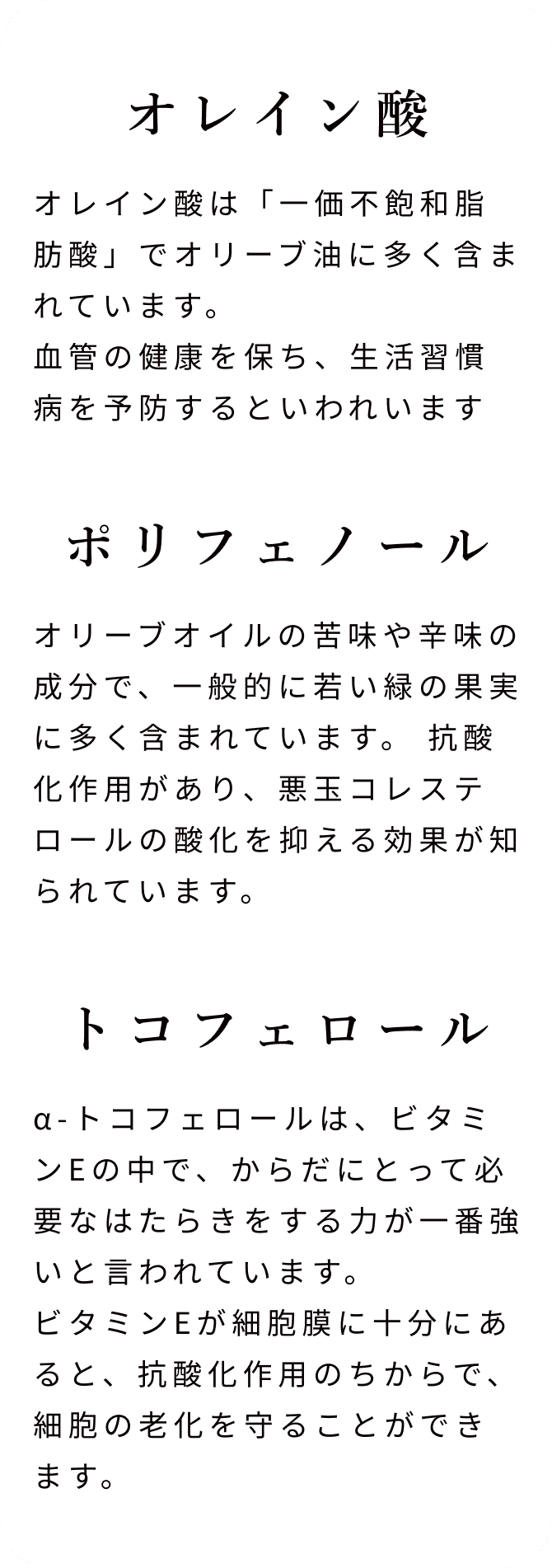 オレイン酸: オレイン酸は「一価不飽和脂肪酸」でオリーブ油に多く含まれています。血管の健康を保ち、生活習慣病を予防するといわれいます。