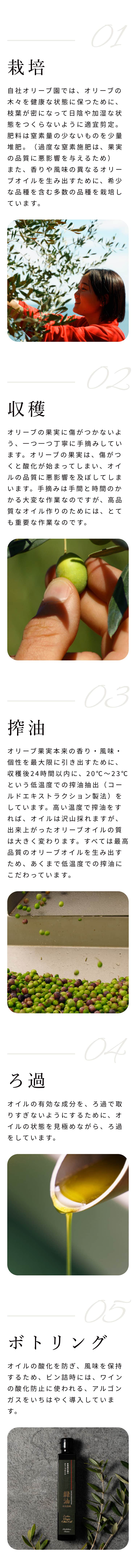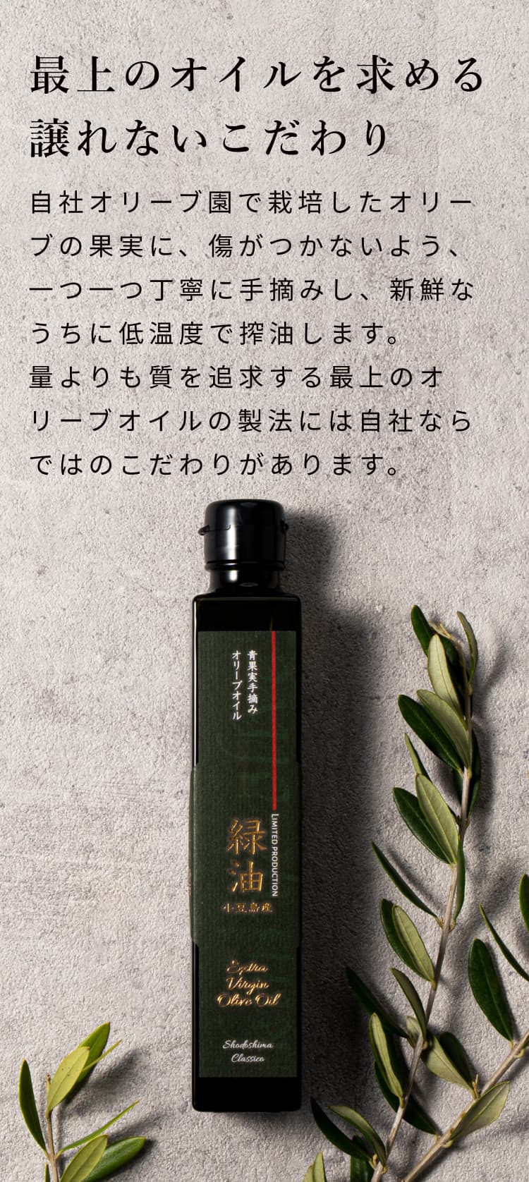希少価値の高い緑のオリーブの実を 1つ1つ手摘みし、丁寧にしぼりました。